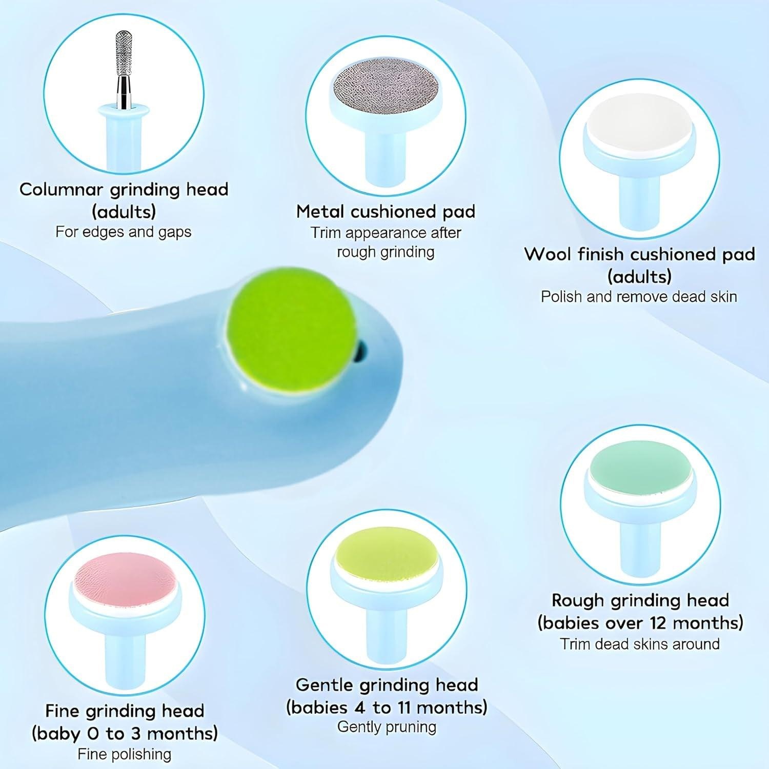 The Baby Nail Trimmer is a safe and efficient way to trim and polish your babys nails, ensuring a smooth manicure without the risk of cutting too deeply or causing discomfort. This electric nail trimmer features 6 interchangeable grinding heads, making it suitable for babies, toddlers, and even adults. The device provides various options for different ages and needs, ensuring your babys nails are gently cared for as they grow.