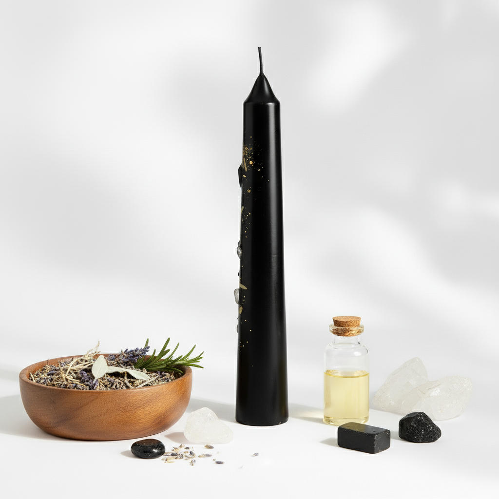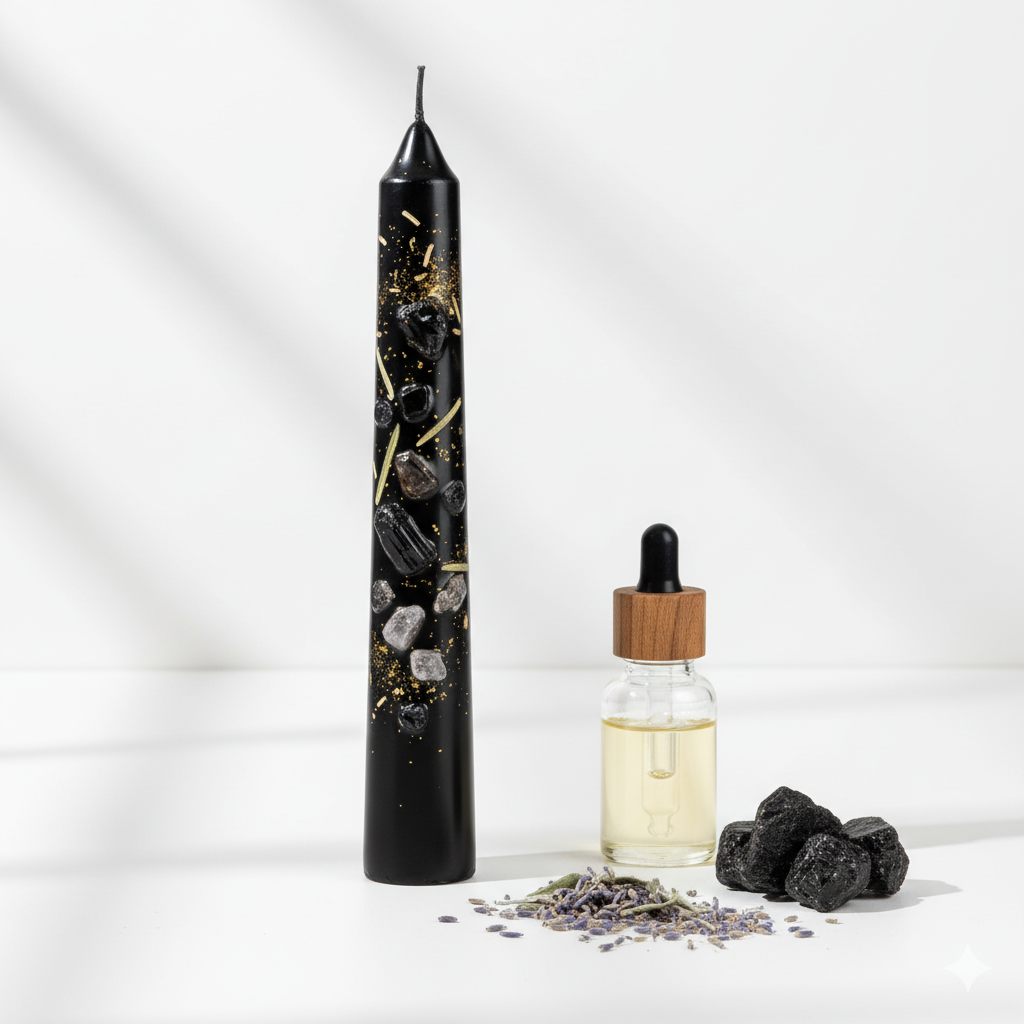 Bring balance, protection, and grounding energy into your daily life with our handcrafted Black Taper Pillar Crystal Healing Candle. Designed with intention and care, this candle combines the power of natural crystals, sacred herbs, and soothing fragrance oils to create a deeply spiritual experience.