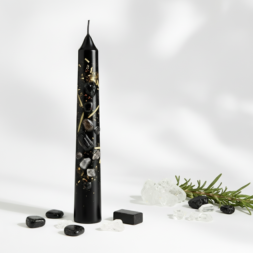 Black Taper Pillar Crystal Healing Candle – Embedded with Obsidian, Black Tourmaline & Herbs for Protection, Cleansing & Grounding Rituals